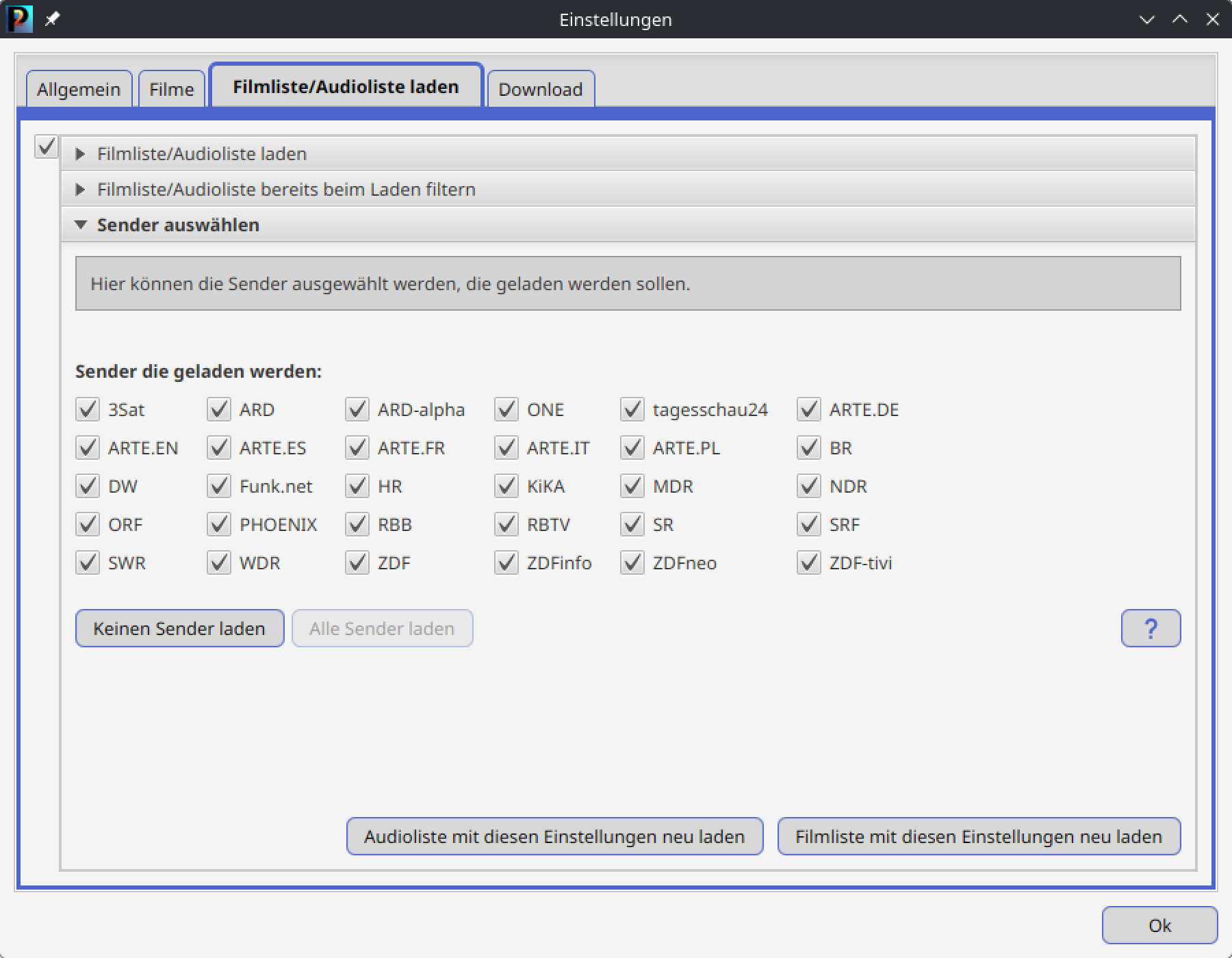 In den Einstellungen kann man das Laden der Filmliste einschränken. Die Liste ist inzwischen sehr lang und so kann es (z.B. bei einem langsamen Rechner) durchaus sinnvoll sein, das Laden auf die eigenen Interessen einzuschränken.